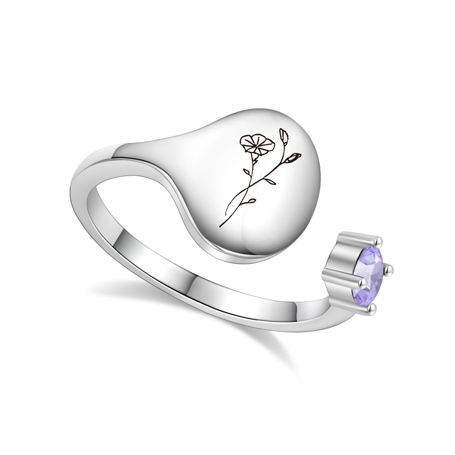 This ring features your birth month's gemstone and a delicately engraved birth flower. The combination celebrates your personal connection to nature and time. With a design for every month, this ring lets you showcase your individuality in a beautiful, lasting way.